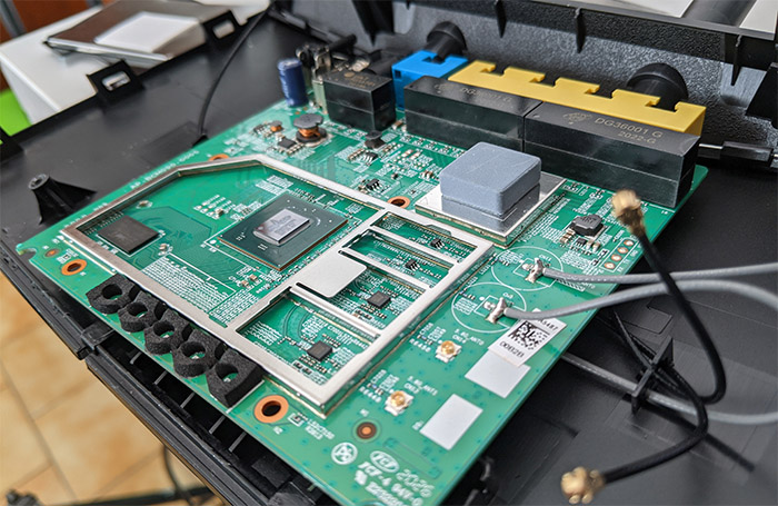 Before opening the case, make sure that you truly need to because you will lose the warranty (there is a seal at the top of a screw) and be aware that this has been the most frustrating router that I had to open until now. There are two screws at the rear side of the router, next to the ports and, since I encountered some resistance while trying to pry open the case, I decided to also check underneath the bottom silicone pads – and Asus has indeed sneakily added two screws under the front-most pads. This way, I could see the PCB which is different than on the RT-AX56U – two antennas are connected as usual to the board, while other two are soldered, which is very uncharacteristic of Asus.