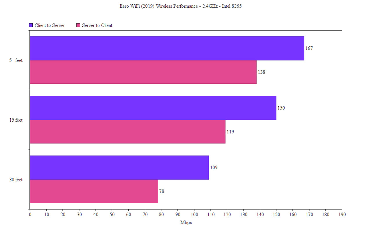 That being said, on the 5GHz network (and a single Eero WiFi node), from the client to the server, I measured an average of 540 Mbps at 5 feet and, at 15 feet, I got around 428 Mbps; at 30 feet, I measured an average of 242 Mbps. From the server to the client, about 5 feet away from the router, I measured an average of 288 Mbps and, at 15 feet, the speed decreased slightly to 272 Mbps; at 30 feet, I measured an average of 201 Mbps. Afterwards, I added the second Eero WiFi at about 35 feet from the main unit and, again, I connected the wireless client to the network.